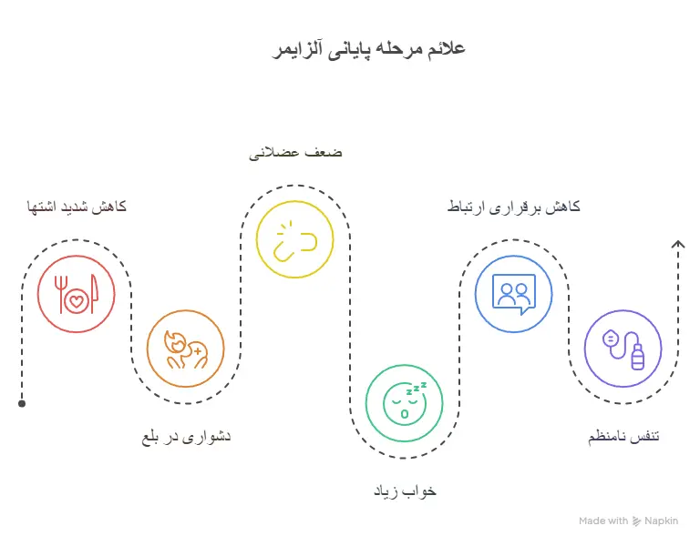 | شدید | از دست دادن گفتار و تحرک، نیاز کامل به مراقبت | مراقبت تسکینی، توجه به تغذیه و آرامش |