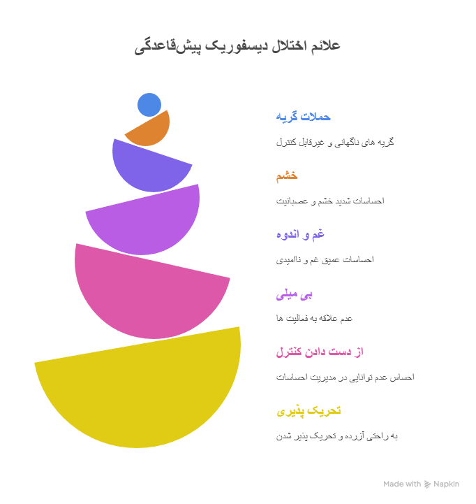 معمولا ۷ تا ۱۰ روز قبل از قاعدگی PMDD رخ میدهد و بسیاری از علائم آن مشابه PMS است.علاوه بر خستگی، نفخ، مشکلات گوارشی و سردرد، افراد مبتلا به اختلال دیسفوریک پیشقاعدگی (PMDD) احساسات خاصی را هم تجربه میکنند.