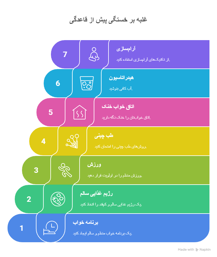 مروری بر مطالعات سال ۲۰۱۴ نشان داد که افرادی که با داروهای گیاهی و طب سوزنی چینی علائم سندرم (PMS) و (PMDD) ، نظیر خستگی را درمان کردند، بهبود قابلتوجهی داشتند. - اتاق خوابتان را خنک نگه دارید.