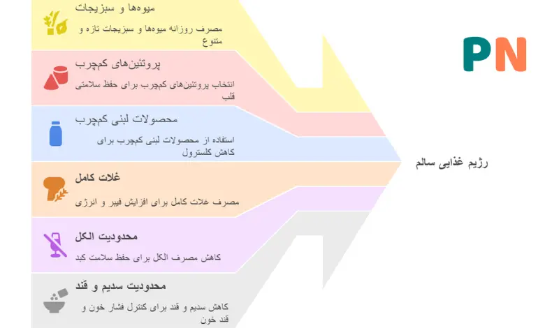 - اولویت قراردادن میوهها، سبزیجات، پروتئینهای کمچرب، محصولات لبنی کمچرب و غلات کامل